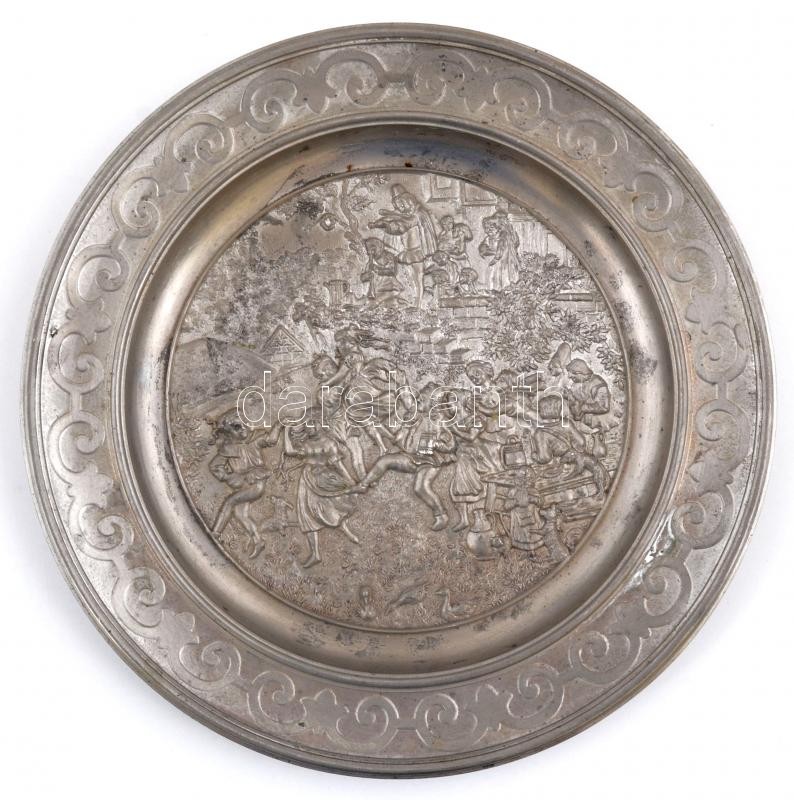 SKS Zinn mulatós jelenetes ón fali tál,d: 21,5 cm