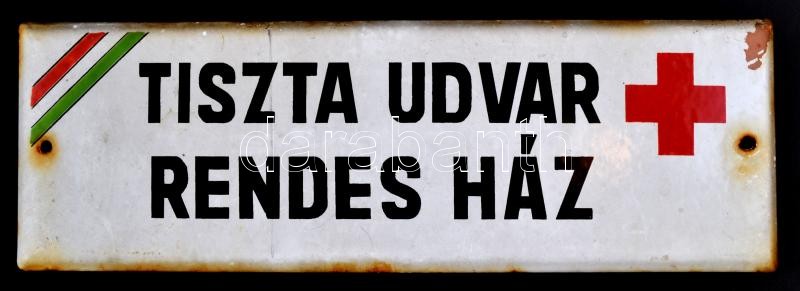 Tiszta udvar, rendes ház - zománcozott fém tábla, rozsdás, 29,5×9,5 cm