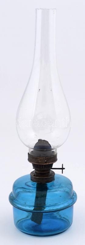 Üveg petróleum lámpa, kék üveg testtel, apró kopásnyomokkal, karcoláso...