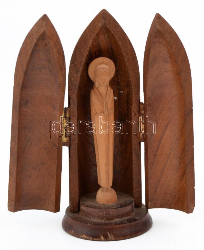 Description: Faragott fa Szűz Mária szobrocska, töltényhüvelyt formázó fa tartóban, kihajtható "szárnyakkal", az egyik szárny részben elválik, rajta repedéssel, m: 10 cm.