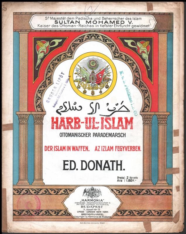 Description: cca 1910 2 db török zeneműveket tartalmazó kottafüzet dekoratív címlapokkal: Harb-Ul-Islam. Az izlám fegyverben.; A török himnusz / 2 Turkish national song and war song notes