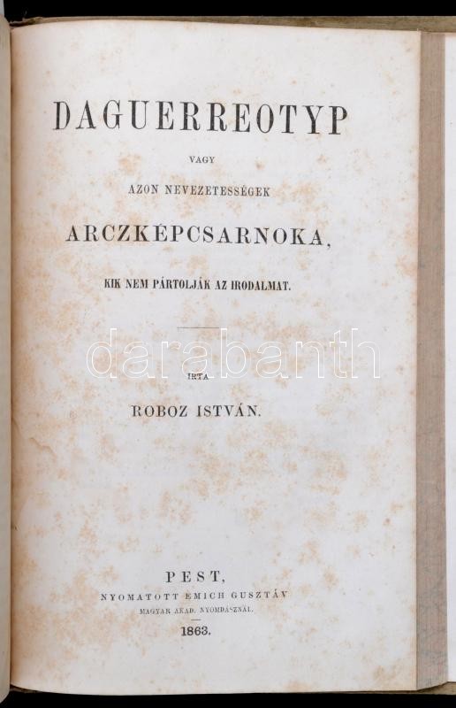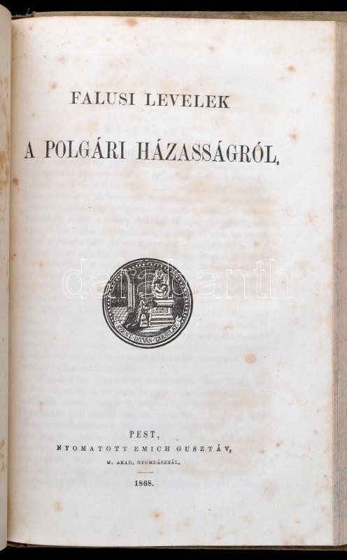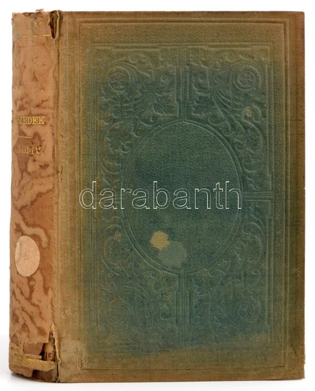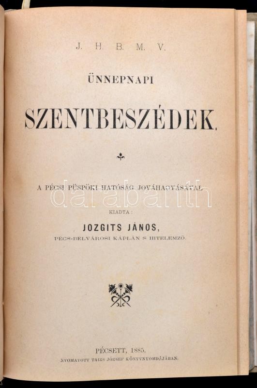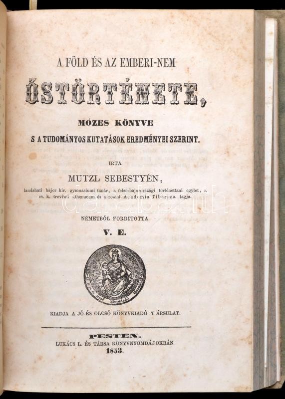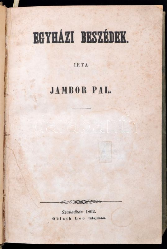 Kolligátum, nagyrészt egyházi témájú művekből, 5 db. (Egybekötve.) : Jámbor Pál: Egyházi beszédek. Szabadka, 1862, Oblath Leo,(Bittermann Károly-ny.) 189+3 p. Jozgits János: Ünnepnapi Szentbeszédek. Pécs, 1885, Taizs József,114+2 p. Mutzl Sebestyén: A föld és az emberi-nem őstörténete, Mózes könyve s a Tudományos kutatások eredményei szerint. Németből fordította: V.E. Pest, 1853, Lukács L. és Társa, VIII+342 p.+1 kihajtható tábla. Falusi levelek a polgári házasságról. Pest, 1868, Emich Gusztáv, 30 p. Roboz István: Daguerreotyp vagy azon nevezetességek arcképcsarnoka, kik nem pártolják az irodalmat. Pest, 1863, Emich Gusztáv, VIII+98-132 p. XIX. század végi aranyozott gerincű egészvászon-kötés, foltos, kissé sérült gerinccel, kopott borítóval, foltos lapokkal.