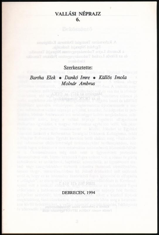Vallási néprajz 6. Szerk.: Bartha Elek, Dankó Imre, Küllős Imola, Molnár Ambrus. Debrecen, 1994, Református Teológiai Doktorok Kollégiuma Egyházi Néprajzi Szekciója. Kiadói papírkötés.