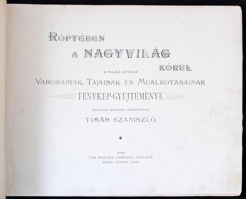 Röptében a nagyvilág körül. A világ kiváló városainak, tájainak és műalkotásainak fénykép-gyűjteménye. Szerk.: Timár Szaniszló. Berlin-London-Párizs, é.n., The Werner Company Chicago. Gazdag fekete-fehér képanyaggal illusztrálva. Kiadói aranyozott, festett egészvászon-kötés, kopott borítóval és gerinccel, néhány foltos lappal, kissé laza fűzéssel, a hátsó szennylapon szakadással és gyűrődéssel.