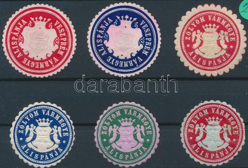 https://www.darabanth.com/en/360-Online-auction/360.0/Hungarian-philately-and-postal-history/Paraphilately~500015/6-db-klf-pecsetbelyeg-Veszprem-es-Zolyom-varmegye-alispanja~II2005968