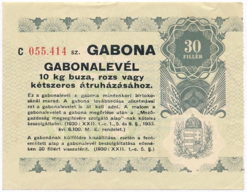 1930. "Gabonalevél - 10 kg búza, rozs vagy kétszeres átruházáshoz" 30f értékben, vízjeles papíron T:III vágás
