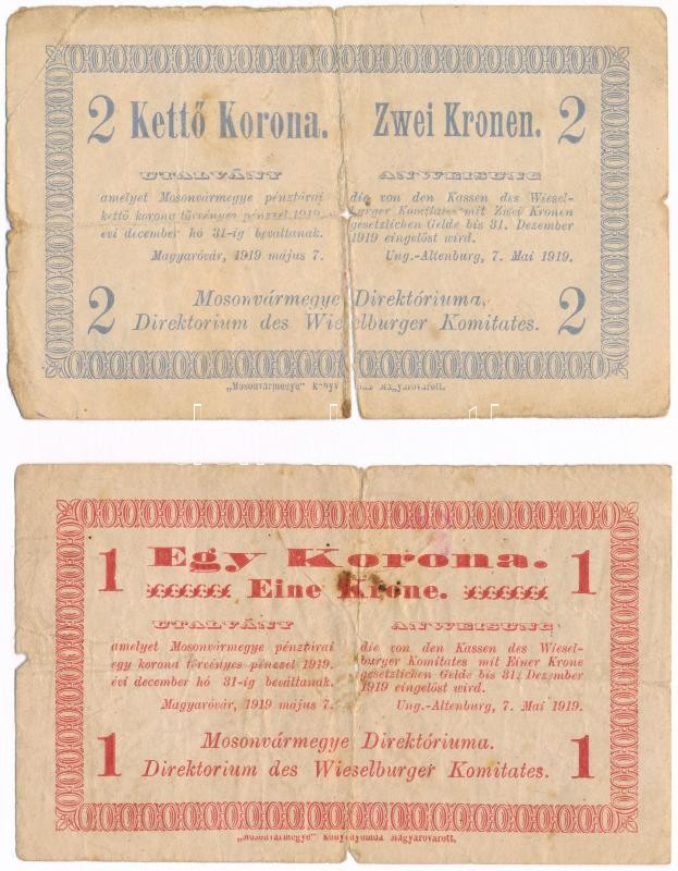 Magyaróvár / Mosonvármegye Direktóriuma 1919.05.07 1K + 2K hátoldalukon bélyegzéssel T:III-,IV