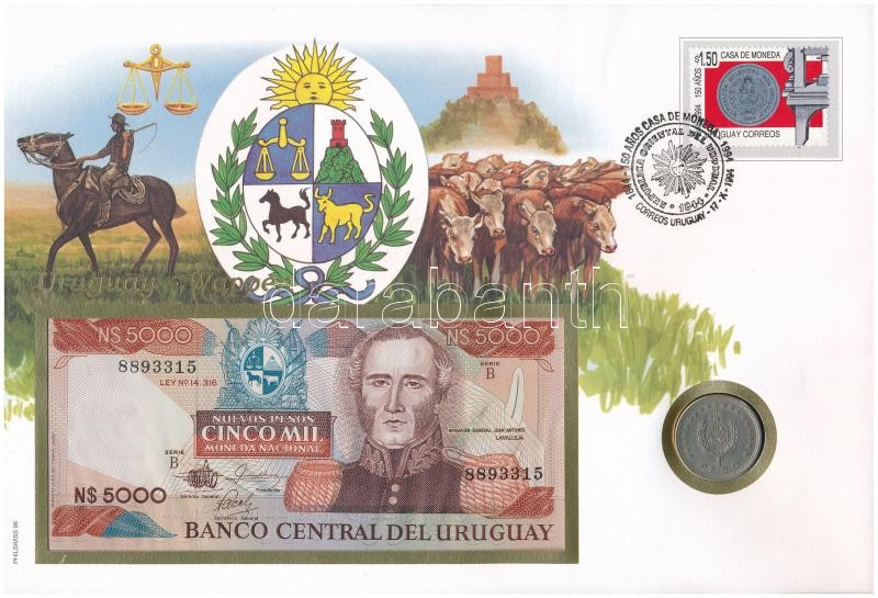 Description: Urugay "Címerek" érmés és bankjegyes, pecsételt boríték benne 1960. 1P Cu-Ni érmével és 1983. 5000P bélyeggel és pecsételt bankjeggyel a PHILSWISS kiadásában, német leírással T:1,I