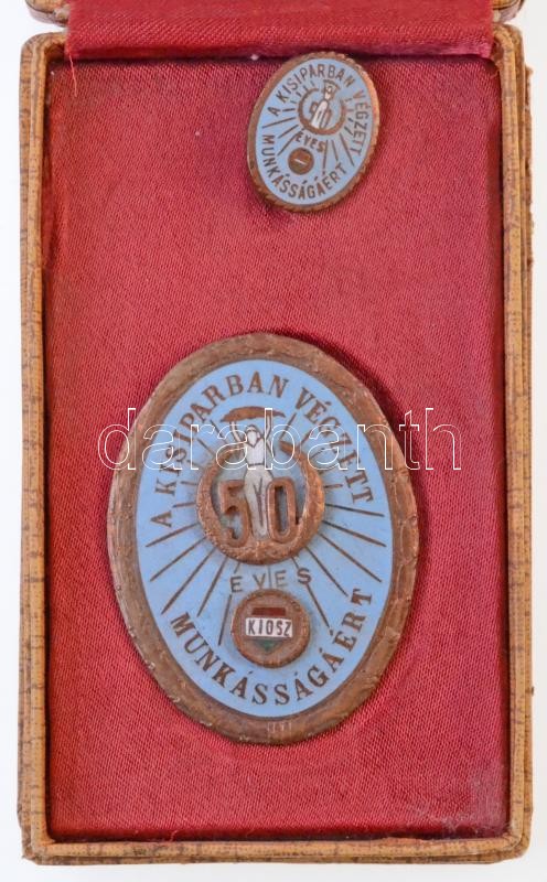 DN "A Kisiparban végzett munkásságáért - 50 éves KIOSZ" zománcozott fém jelvény, miniatűrrel, sérült dísztokban T:2