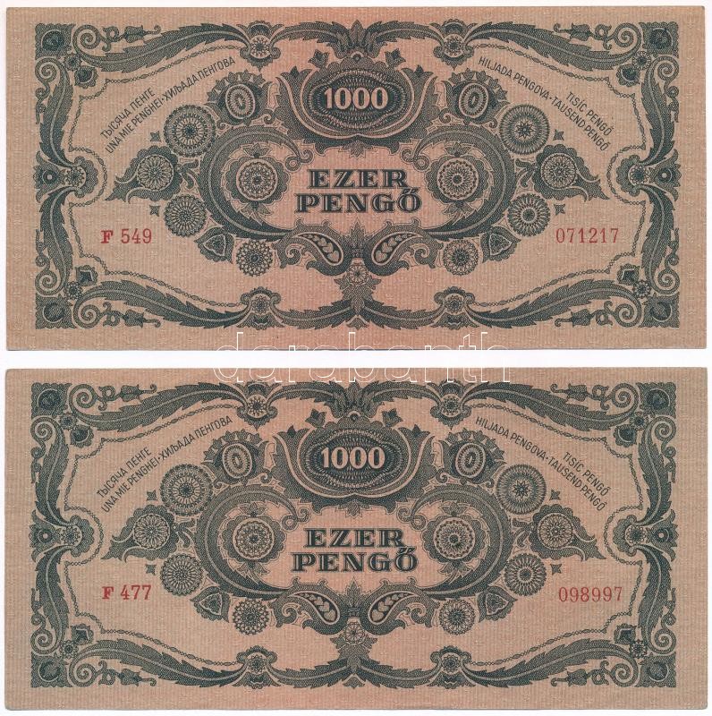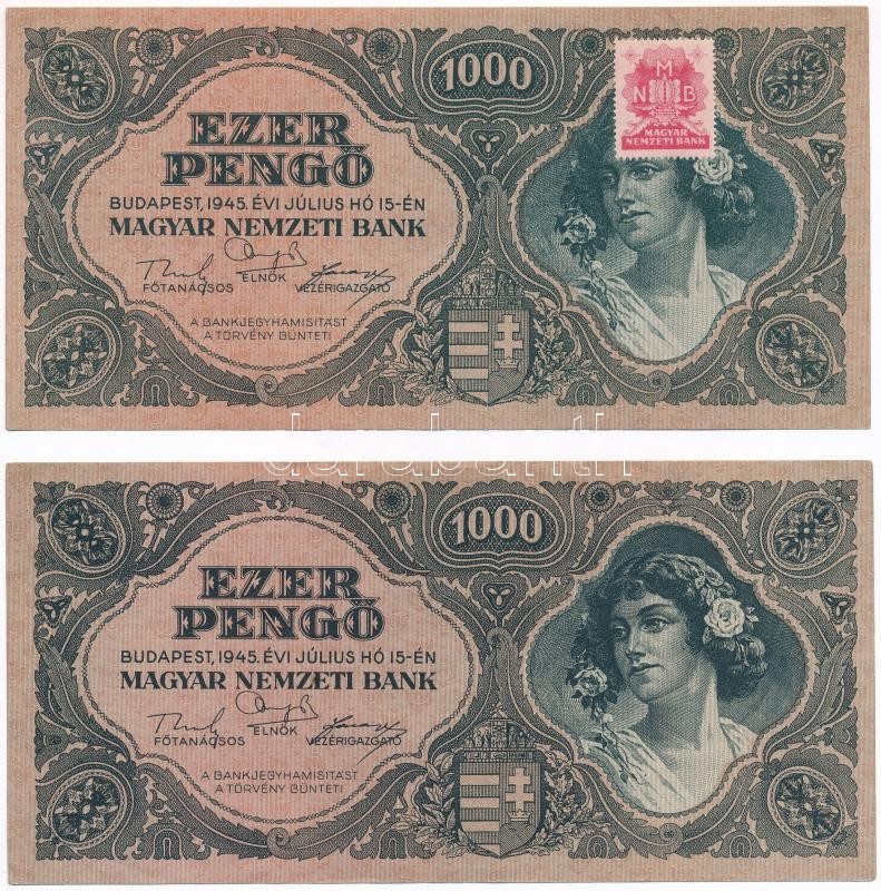1945. 1000P (2xklf) egyik piros MNB bélyeggel, a másik bélyeg nélkül T...
