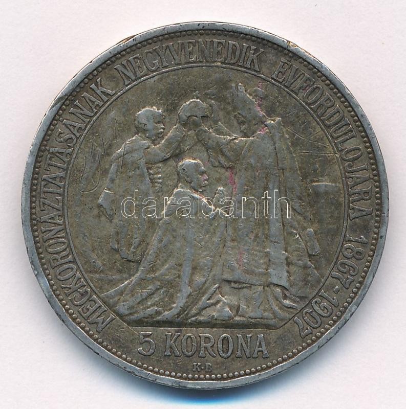 https://www.darabanth.com/en/360-Online-auction/360.0/Numismatics/Hungarian-coins-and-coins-with-Hungarian-mint-marks~2000008/1907KB-5K-Ag-Ferenc-Jozsef-koronazasanak-40-evforduloja-T2-patina-Adamo-K71~II2040834