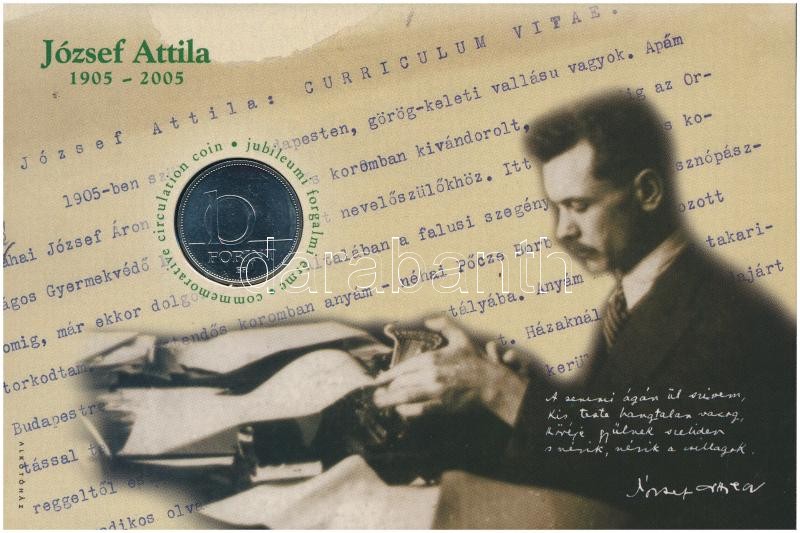 https://www.darabanth.com/en/360-Online-auction/360.0/Numismatics/Hungarian-coins-and-coins-with-Hungarian-mint-marks~2000008/2005-10Ft-Cu-Ni-Jozsef-Attila-sorszamozott-emleklapon-T1~II2063805