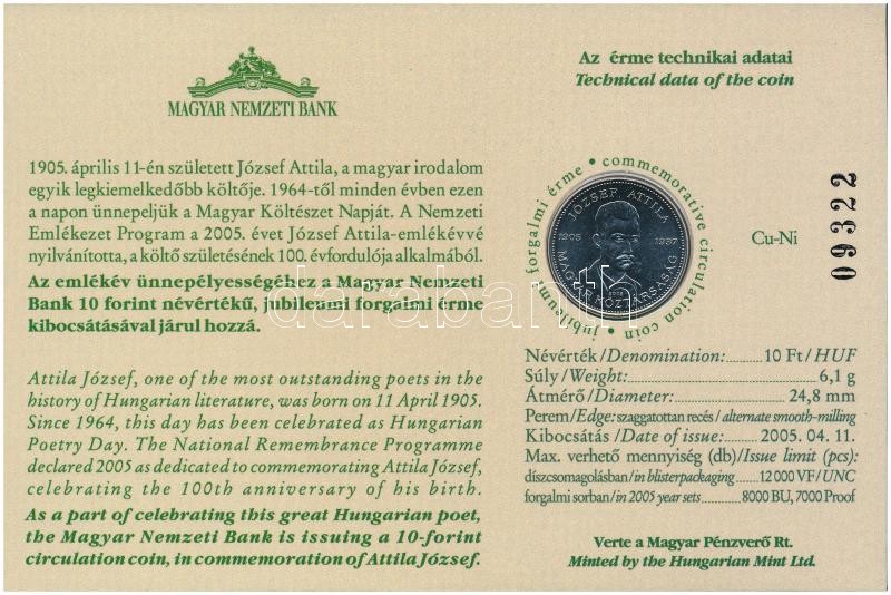 2005. 10Ft Cu-Ni "József Attila" sorszámozott emléklapon T:1