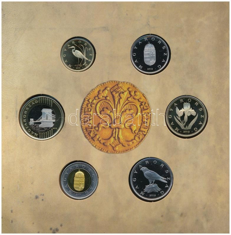 https://www.darabanth.com/en/360-Online-auction/360.0/Numismatics/Hungarian-coins-and-coins-with-Hungarian-mint-marks~2000008/2012-5Ft-200Ft-6xklf-forgalmi-szett-Az-elso-magyar-aranyforint-plus-I-Karoly-aranyforintjanak-~II2064078
