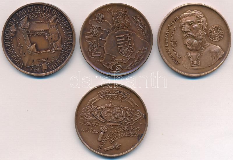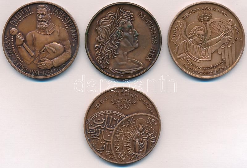 Description: 4db klf Br emlékérem, közte Buda István (1952-) 1987. "MÉE Budapest - Pálfy Tamás Palotai Várkapitány" Br emlékérem (42,5mm), Fritz Mihály (1847-) 1990. "Mathias Rex / MÉE Szeged" Mátyás király halálának 500. évfordulója, Br emlékérem (42,5mm) T:1-