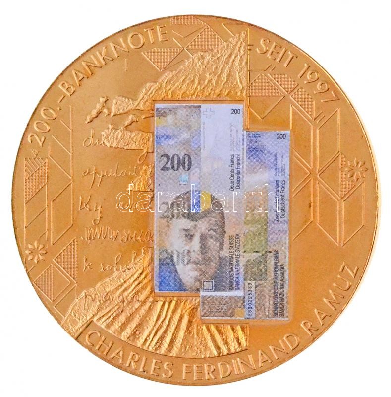 Svájc DN "200.-banknote seit 1997" fém emlékérem 200Fr svájci bankjegy multicolor képével (50mm) T:1 Switzerland ND "200.-banknote seit 1997" metal commemorative medallion with the multicolor image of 200 Francs banknote (50mm) C:UNC