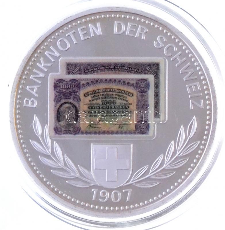 Svájc DN "Banknoten der Schweiz 1907 / Billets de Banque de Suisse - Banconote della Svizzera" ezüstözött Cu-Ni emlékérem 1000Fr svájci bankjegy multicolor képével, tanúsítvánnyal (40mm) T:PP Switzerland ND "Banknoten der Schweiz 1907 / Billets de Banque de Suisse - Banconote della Svizzera" silver plated Cu-Ni commemorative medallion with the multicolor image of 1000 Francs banknote, with certificate (40mm) C:PP