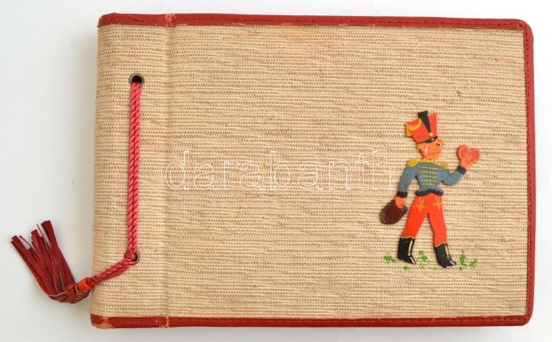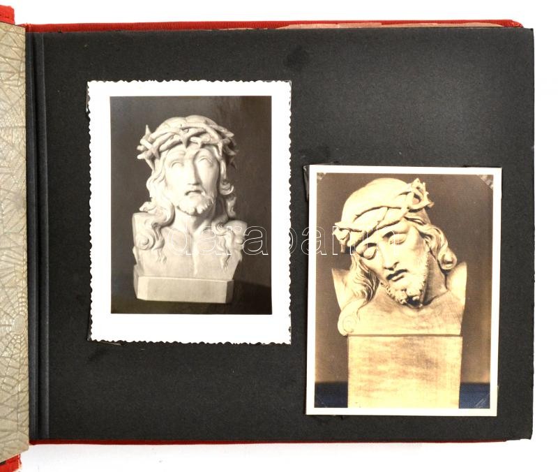 Description: 1943 Budapest, Dénes Miklós (?-?) fafaragó munkái a Műcsarnok tavaszi kiállításán, 22 db fotó, albumba rendezve + Dénes Miklós aláírása 1961-es levelezőlapon