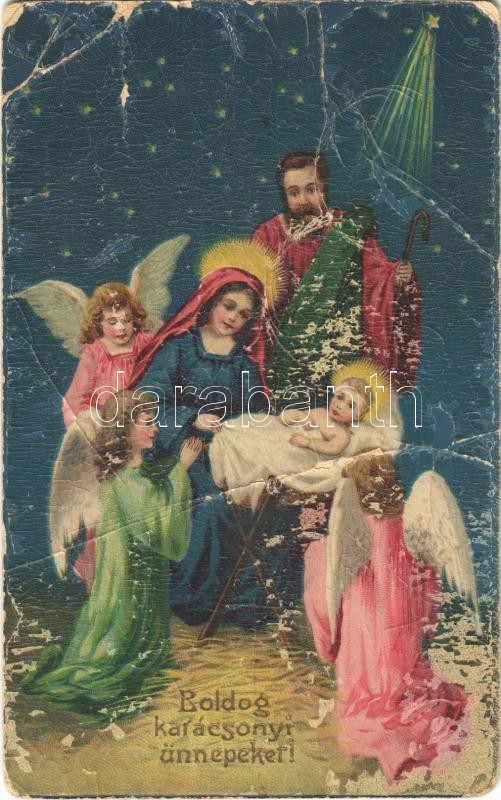 1910 "Boldog karácsonyi ünnepeket!", üdvözlőlap / Baby Jesus in the manger, Virgin Mary, St. Joseph, angels, Christmas greeting card, litho (fa)