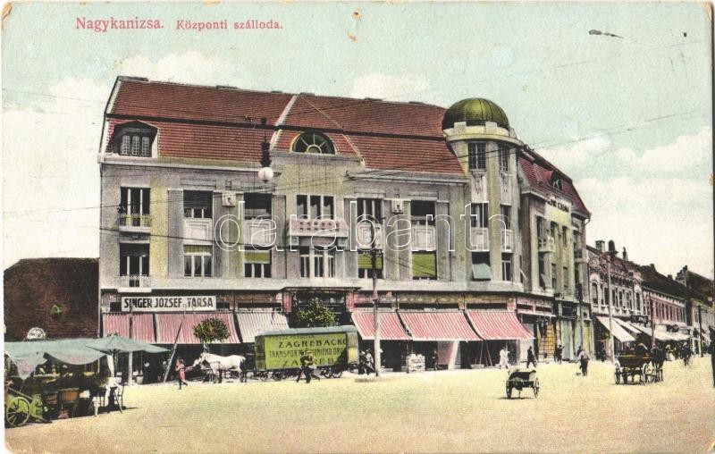 1914 Nagykanizsa, Központi szálloda, Singer József és Társa üzlete, zá...