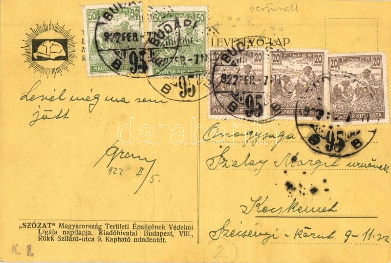 Description: A rablók kezei. Kiadja a Szózat Magyarország Területi Épségének Védelmi Ligájának napilapja + bélyegzések, perforált bélyeg a hátoldalon / The hands of robbers. Hungarian irredenta propaganda, Trianon s: Helbing Aranka
