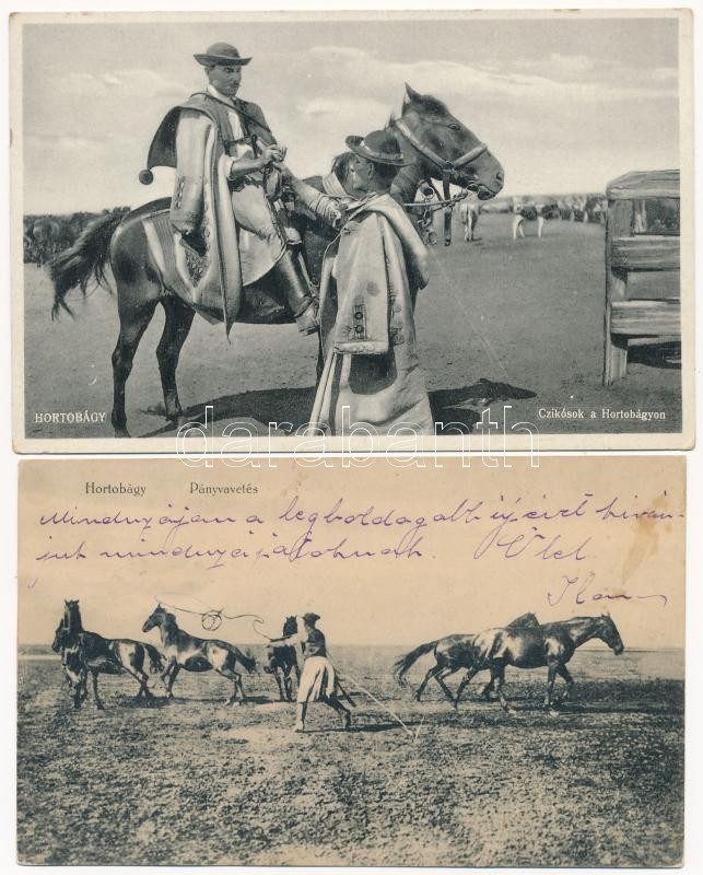 5 db régi magyar folklór lap: Hortobágy / 5 pre-1945 Hungarian folklore motive cards