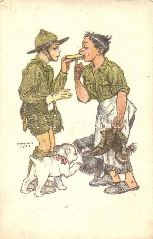 A cserkész minden cserkészt testvérének tekint. Kiadja a Magyar Cserkészszövetség Nagytábortanácsa 1926. / Hungarian scout art postcard s: Márton L.