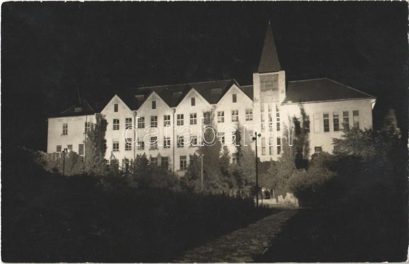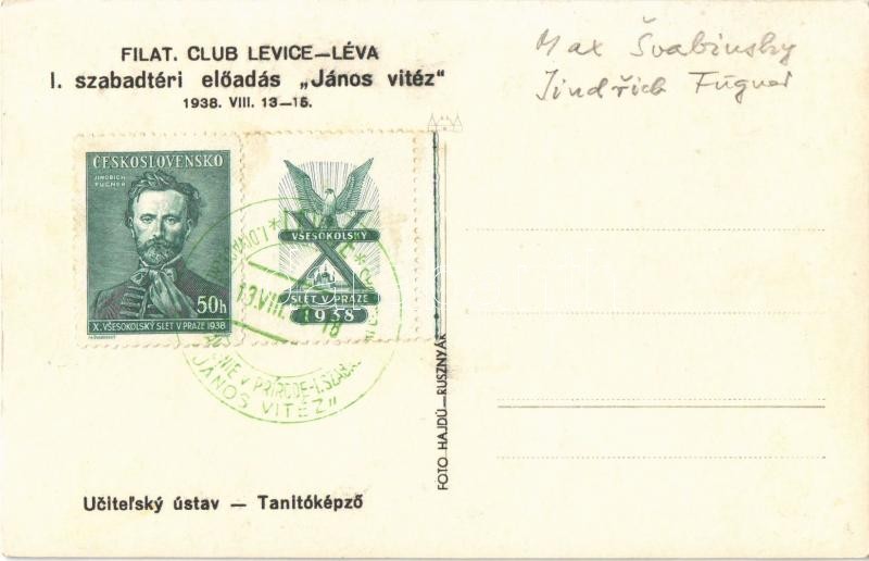 Description: 1938 Léva, Levice; Állami tanítóképző este. I. szabadtéri előadás "János Vitéz". Foto Hajdú-Rusznyák / Filat. Club Levice, Ucitelksky ústav / teachers' training institute at night + So. Stpl
