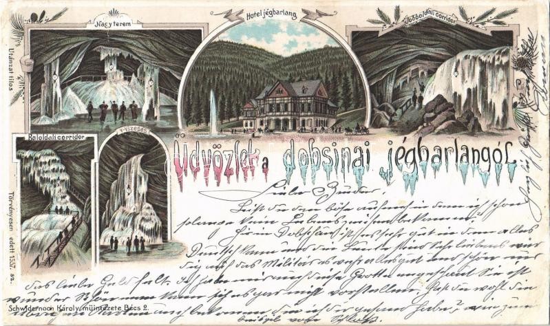 Description: Dobsina, Dobschau; Üdvözlet a dobsinai jégbarlangból! Nagyterem, Jobb és bal oldali korridor, vízesés, Hotel Jégbarlang szálloda / ice cave interiors, hotel, waterfall. Schwidernoch Károly 1557. Art Nouveau, floral, litho (r)