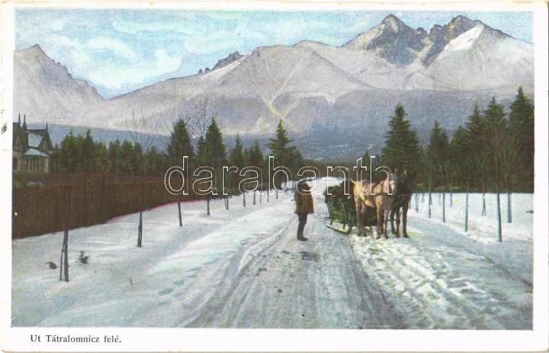 Tátra, Vysoké Tatry; Út Tátralomnic felé, lovasszán télen a hóban. Hát... https://www.darabanth.com/en/360-Online-auction/360.0/Postcards/Slovakia~1000007/Tatra-Vysoke-Tatry-Ut-Tatralomnic-fele-lovasszan-telen-a-hoban-Hatoldalon-Tonogen-es-R~II2074207