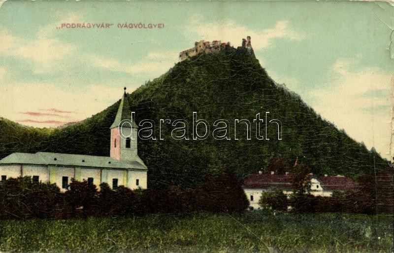 Vágváralja, Vág-Pohrágy, Povazské Podhradie (Vágbeszterce, Povazská Bystrica); vár, templom, kastély a Vágvölgyben. W. L. Bp. 306. Kiadja Löwy Fülöp / Das Waagthal, Burg Podragy / Váh Valley, castle, church / Povazie, Povazsky hrad (kis szakadások / small tears)