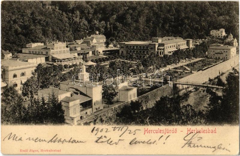 1902 Herkulesfürdő, Herkulesbad, Baile Herculane; látkép, híd, fürdő. Kiadja Emil Jäger / general view, bridge, bathing house, spa hotel, baths (EK)