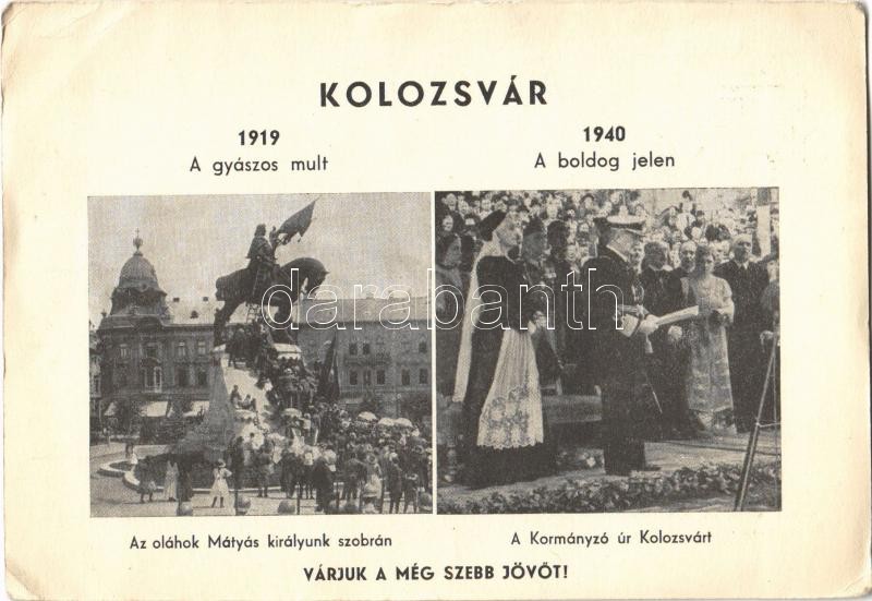 Description: Kolozsvár, Cluj; 1919 A gyászos múlt, amikor az oláhok ledöntötték Mátyás királyunk szobrát.1940 A boldog jelen, Horthy Miklós és felesége a bevonuláskor. Vártjuk a még szebb jövőt! Kiadja Erdélyért Székely Hadosztály Egyesület 1918-1919 / in the past and in the present. Irredenta (EK)