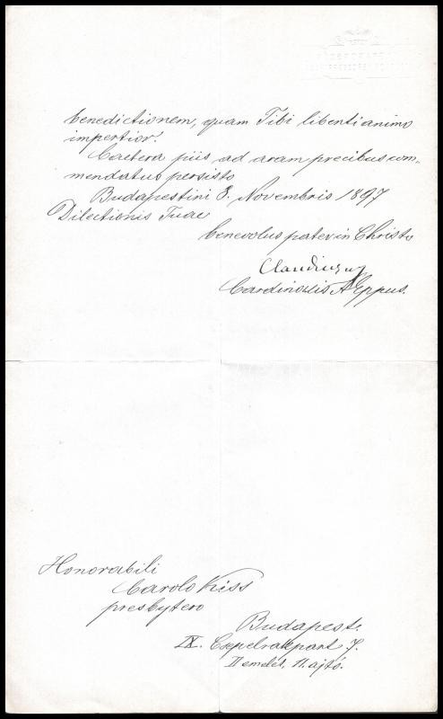 1897 Vaszary Kolos (1832-1915) bíboros által saját kézzel aláírt kétoldalas latin nyelvű levél