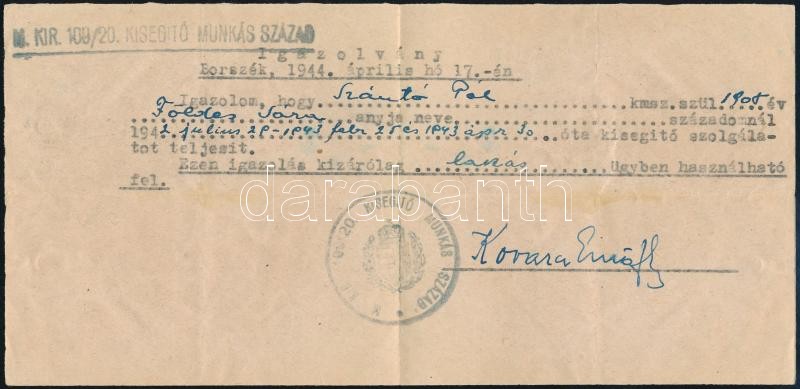 Description: 1944 Borszék, Szántó Pál zsidó származású munkaszolgálatos részére kiadott igazolvány a Borszékre áthelyezett M. kir. 109/20-as Kisegítő Munkás Századtól