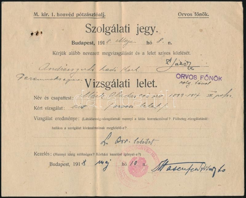 1918 Bp., M. kir. 1. honvéd pótzászlóalj által kiállított szolgálati j...