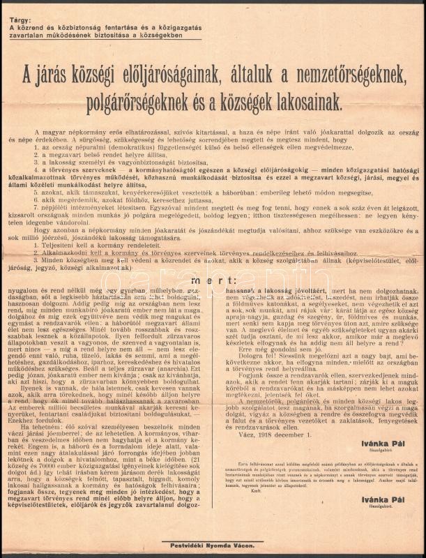 Description: 1918 december 1. Vác, A járási községi elöljáróságainak, általuk a nemzetőrségeknek, polgárőrségeknek és a község lakosságának. A közrend biztosítása miatt. HIrdetmény 32x39 cm