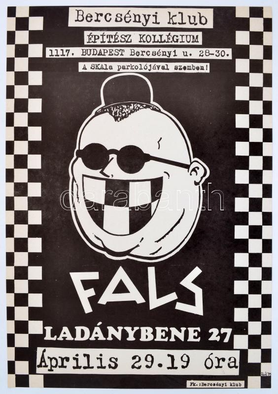 1989 Rádi Sándor (?-?): Bercsényi Klub. Fals!, Ladánybene 27., 1989. Április 29., Underground koncertplakát, ragasztásnyomokkal, 41x28 cm.