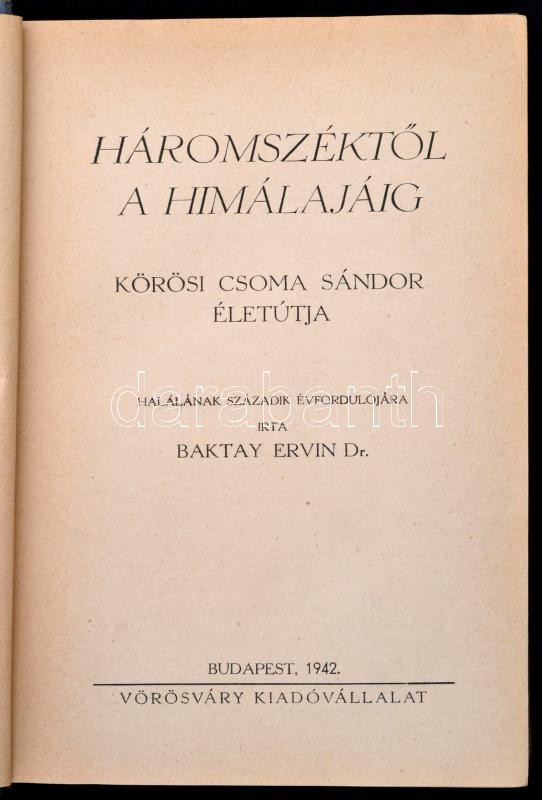 Baktay Ervin: Háromszéktől a Himalájáig. Körösi Csoma Sándor életútja. Bp., 1942. Vörösváry kiadó, (Bányai és Várkonyi-ny.), 299+5p.+16 t. (fekete-fehér képtáblák.) + 2 lapszámozáson belüli egészoldalas térképvázlattal. Kiadói félvászon kötésben, kissé kopott borítóval. Első kiadás.