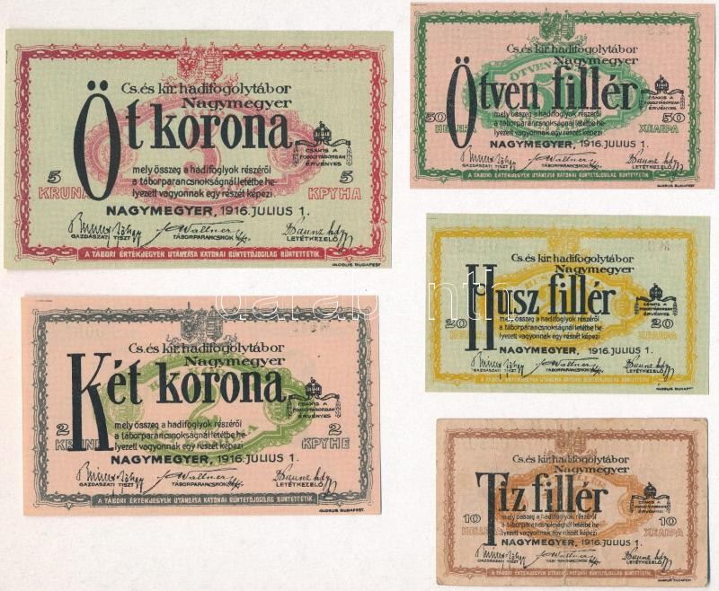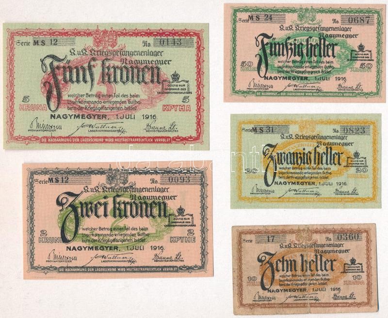 Nagymegyer / hadifogolytábor 1916. július 1. 10f arab sorozat- és sorszámmal + 20f arab sorozat- és sorszámmal, "MS" betűjelzéssel + 50f arab sorozat- és sorszámmal, "MS" betűjelzéssel + 2K arab sorozat- és sorszámmal, "MS" betűjelzéssel + 5K arab sorozat- és sorszámmal, "MS" betűjelzéssel T:I, III- Adamo HHN-1.1, HHN-1.2.1, HHN-1.3.1, HHN-1.5.1, HHN-1.6.1