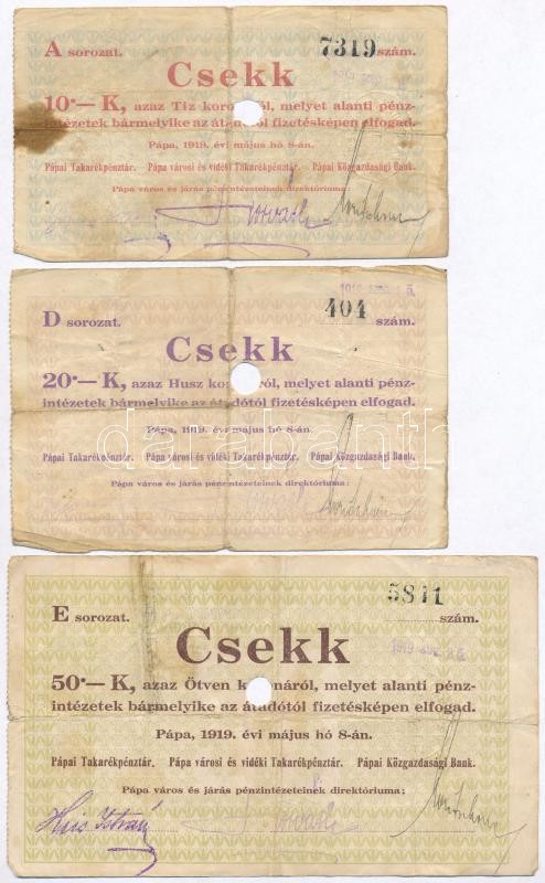 Pápa 1919. május 8. "Pápai csekk" 10K + 20K + 50K mind lyuka...