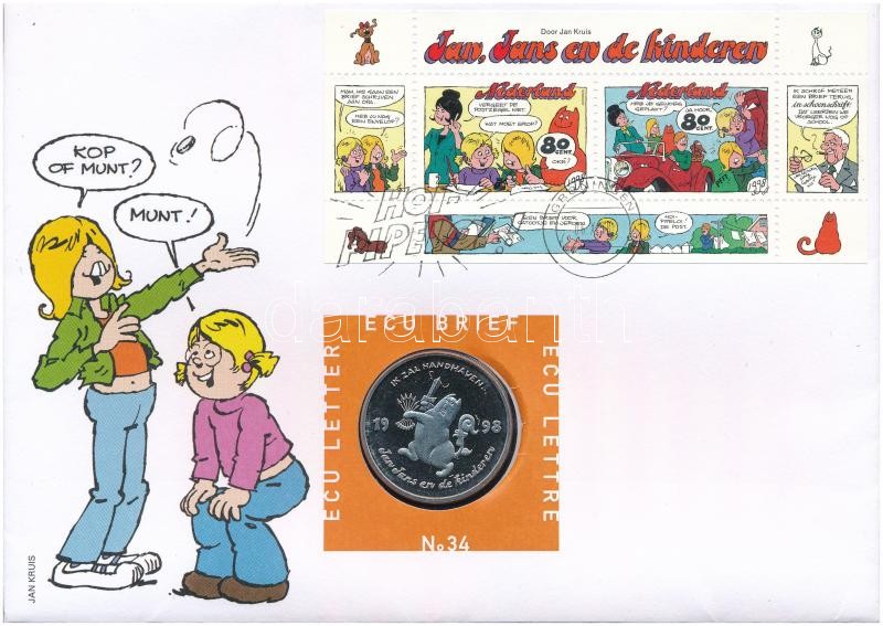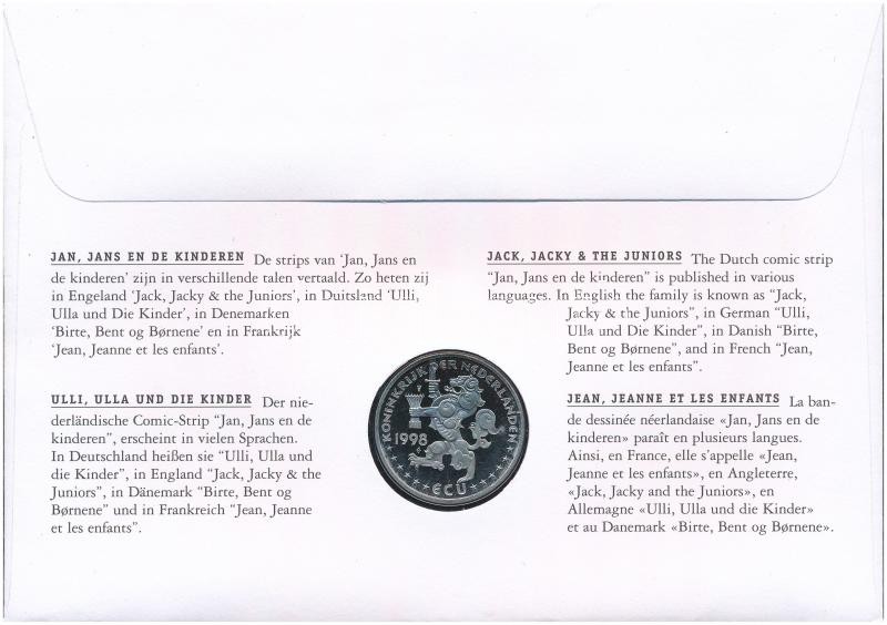 Netherlands 1998. 1 Ecu "Jan, Jans en de Kinderen" in envelope with stamps and cancellation, with descriptions in four languages on the back T:UNC