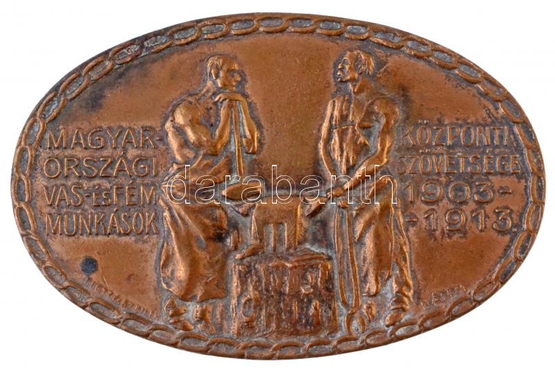 Lányi Dezső (1879-1951) / Klett és Szeiler (vésnöküzem) 1913. "Magyarországi Vas- és Fémmunkások Központi Szövetsége 1903-1913" bronz ovális jelvény (37x57mm) T:2 tű hiányzik