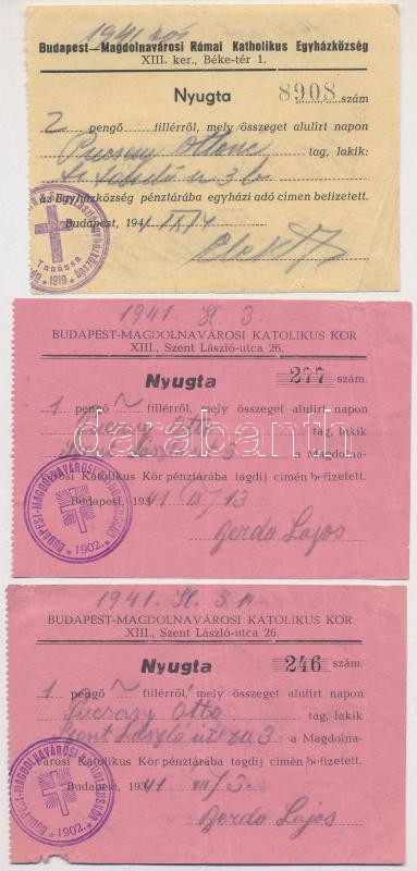 1941. "Budapest-Magdolnavárosi Római Katholikus Egyházközség" 3db kitöltött nyugta, bélyegzésekkel T:III