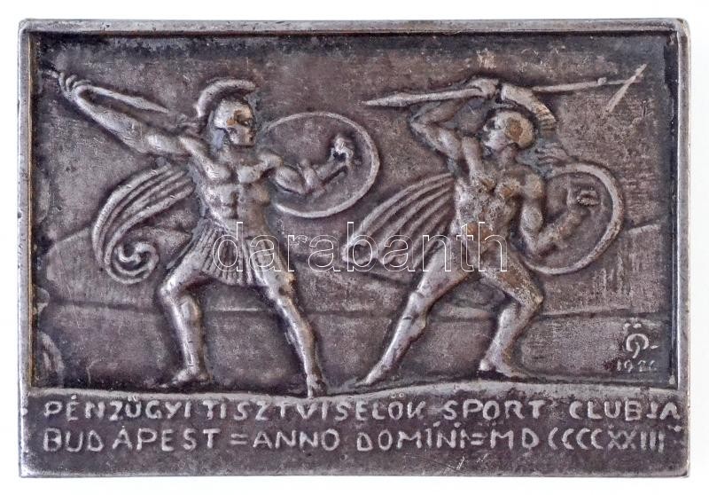 Description: 1926. "Pénzügyi Tisztviselők Sport Clubja Budapest = Anno Domini MDCCCCXXIII" kétoldalas, öntött ezüstözött Br plakett. Szign.: ÖP(?) (34x51mm) T:2 ph.