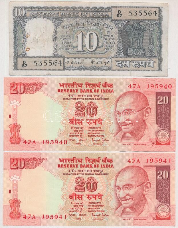 India ND 10 Rupees + 2002. 20 Rupees (2x) C:UNC-VG hole