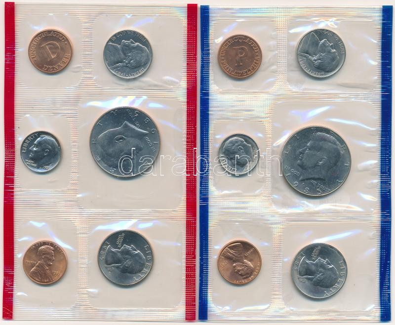 Amerikai Egyesült Államok 1985D 1c-1/2$ (5xklf) + "Denver zseton + 1985P 1c-1/2$ (5xklf) + "Philadelphia" zseton forgalmi sorok fóliatokban tanúsítvánnyal T:1 USA 1985D 1 Cent - 1/2 Dollar (5xdiff) + "Denver" jeton + 1985P 1 Cent - 1/2 Dollar (5xdiff) + "Philadelphia" jeton coin sets in foil packing with certificate C:UNC