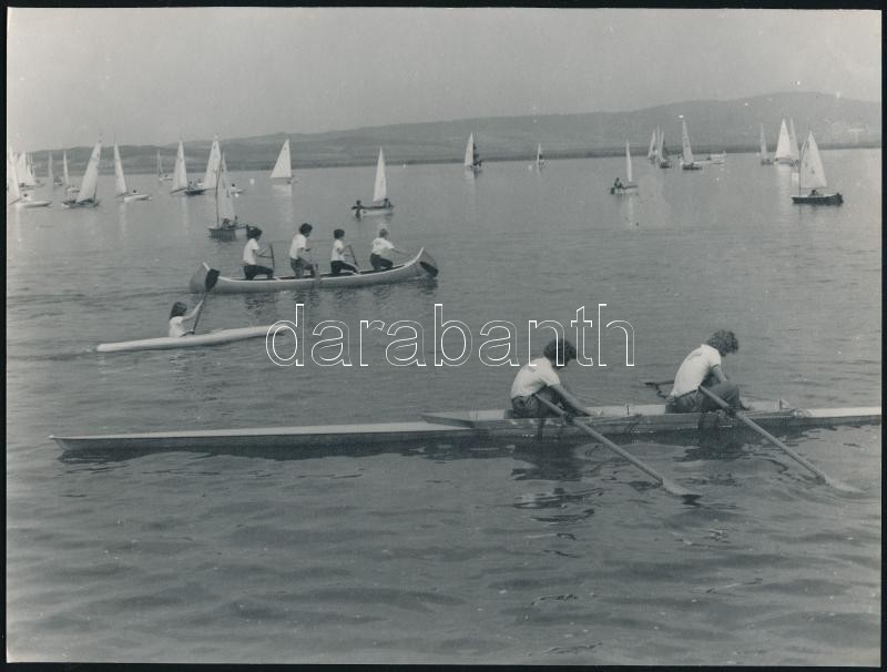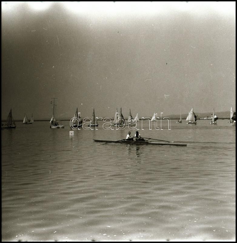 Description: cca 1965 Velencei-tó, Sinka Antal - a velencei Agrokomplex fotósának - képriportja, 8 db vintage negatív, 6x6 cm + cca 1960 Sinka István: Evezősök, vitorlások kint a vízen, jelzetlen fotó a szerző hagyatékából, 18x24 cm
