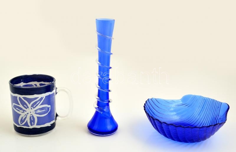 Vegyes üveg tétel, 3 db, bögre, vázácska, tálka, a váza tetején apró lepattanásokkal, m: 9 cm, d: 8 cm, m: 20 cm, m: 4,5 cm, d: 15 cm.