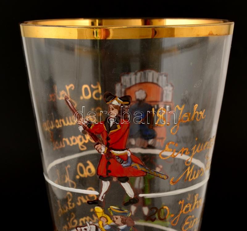 cca 1900 emlék talpas pohár, kézzel festett, jelzés nélkül, kopás nyomokkal, m: 24,5 cm